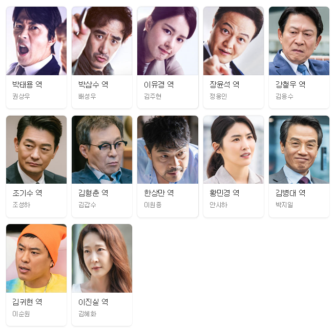 박태용역할(권상우) 박삼수역할(배성우) 이유경역할(김주현) 장윤석역할(정웅인) 강철우역할(김응수) 조기수역할(조성하) 김형춘역할(김갑수) 한상만역할(이원종) 황민경역할(안시하) 김병대역할(박지일) 김귀현역할(이순원) 이진실역할(김혜화) 등이며 몇부작? 1화 2회 3화 4회 5화 6회 7화 8회 9화 10회 11화 12회 13화 14회 15화 16회(마지막회/결말) 최종까지 16부작입니다. 재밌는 스토리전개와 줄거리로 시청률도 잡고! 금토드라마가 계속 흥하길! 넷플릭스는 모르겠습니다. 공중파는 대부분 웨이브(wavve)에서 많이 해주더라구요~감사합니다.